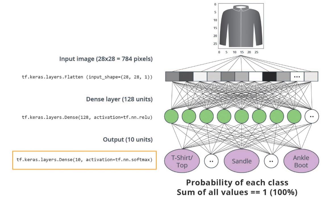 tf.keras.layers.Dense— এর কনফিগারেশন আগের মতো। ডেন্স। আউটপুট লেয়ারে আপনাদের অবশ্যই মনে আছে আমাদেরকে ক্লাসিফাই করতে হবে দশটা অবজেক্ট। ১০ ধরনের কাপড়, চোপড়, জুতা এগুলোকে যখন ক্লাসিফাই করব তখন অ্যাক্টিভেশন লেয়ার হিসাবে ব্যবহার করব 'সফটম্যাক্স'। 'সফটম্যাক্স' এর কাজ হচ্ছে তাকে যদি দশটা ভ্যালু দেয়া হয় সে সবার ম্যাক্সিমাম ভ্যালু, সবচেয়ে বড় ভ্যালুটা পিক করবে পরের লেয়ারে পাঠাতে। এই ফাংশন আমাদের অনেক কোডিং বাঁচায়।